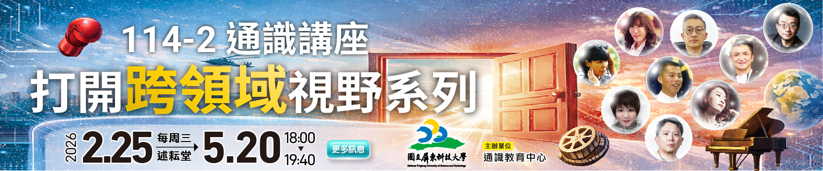 2026-01-12 屏科大通識中心二月盛事預告:2026 台灣通識研討會二次徵稿 &… 2026-01-09 【徵才】公告通識教育中心徵聘教學助理若干名。 2026-01-02 【徵才】公告通識教育中心徵聘教學助理若干名。 2025-12-24 大學AI了沒?2026第二屆屏科大AI創意生成競賽,歡迎本校學生踴躍報名… 2025-12-02 (時間更新)114-1通識講座邀請台大管中閔前校長至本校演講,歡迎本校師… 2025-10-21 感謝永續食力與本校通識教育中心合辦1場「大學氣候變遷了沒」闖關活動,歡迎… 2025-10-02 公告本校通識中心舉辦人文學院SIG計畫「大學「氣候變遷」了沒?」闖關活動… 2025-10-01 恭喜本中心許舜傑老師原創小說「深度安靜」改編同名電影榮獲2025第九屆平… 2026-01-28 拓展國際人文視野:杜正宇助理教授受邀至香港教育大學進行學術交流 2026-01-28 深化國際公民參與交流:簡赫琳教授赴菲律賓分享臺灣參與式民主經驗 2026-01-04 二月盛事預告:2026 台灣通識研討會二次徵稿 & AI 創意生成競賽即將啟動 2026-01-04 本校教授團隊參與2026 年《通識學刊:理念與實務》編輯委員會成員 2025-11-29 教育部「第12屆全國傑出通識教育教師獎遴選及獎勵實 施計畫」,歡迎本校符合資格教師,報名參加遴選推薦! 2025-11-24 從遊戲到思辨:同學們眼中的「大學氣候變遷了沒」活動 校外活動 2025-11-29 教育部「第12屆全國傑出通識教育教師獎遴選及獎勵實 施計畫」,歡迎本校符合資格教師,報名參加遴選推薦! 2025-03-14 2025通識教育之創新與發展—SDGs永續發展 × 差異同理 × 跨域合作與對話國際研討會曁臺灣通識教育聯盟曁品質策進會年會 2025-03-14 教育部提升大學通識教育中程計畫(IGER) -生命教育與通識素養線上研討會:實務、培力與專書發表 2025-02-04 國立清華大學辦理「通識課程與AI創新教學線上研習」,請教師踴躍報名參加! 2025-01-10 請老師踴躍申請環境部辦理之「環境部補助大專校院環境創意教學活動計畫」 2025-01-03 故宮博物院提供大專院校藝術、博物館、文史相關科系「教師免費參觀證明」申請流程說明及申請表 網站連結 榮譽榜 2025-09-30 恭喜本中心許舜傑老師原創小說「深度安靜」改編同名電影榮獲2025第九屆平遙國際電影展-獲最佳影片獎及最佳男演員 2025-09-04 恭賀!古佳峻老師通識課程引導學生,勇奪地方創生競賽冠軍 2025-09-04 恭喜王國安教授榮獲本校113學年度(A類)專業教學特優教師獎! 2025-05-14 2025 屏科大AI 創意生成競賽-得獎名單 查看更多