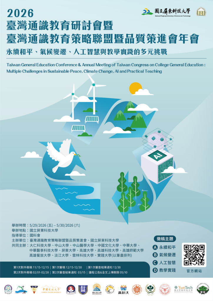 我們誠摯邀請您參加2026臺灣通識教育研討會暨臺灣通識教育策略聯盟暨品質策進會年會,將於2026年5月29日(星期五)至5月30日(星期六)在國立屏東科技大學舉行。本次研討會的主題為「永續和平、氣候變遷、人工智慧與教學實踐的多元挑戰」,將聚焦於當前全球面臨的重大議題,並探討如何透過通識教育培養學生解決這些挑戰的能力。
